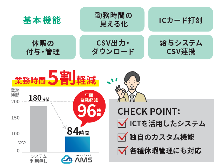 AMSは、自治体職員の勤怠を簡単に一括管理できるクラウド型勤怠管理システムです。従来の紙への記入 やデータ入力、計算作業を不要にし、すべてAMS内で完結。約割の事務作業軽減を実現し、一般職員の約割、管理職の約割がその効果を実感しています。ICカードによる打刻情報や申請内容が自動で出勤簿に反映され、給与システムとのCSV連携もスムーズに行えます。