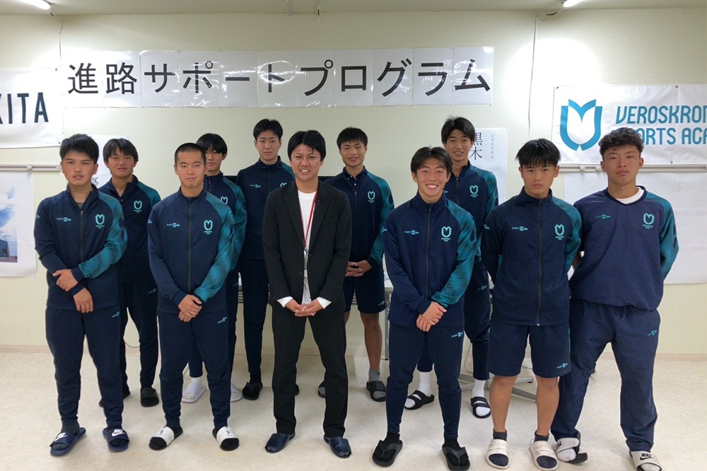 ツノスポーツアカデミーは、宮崎県都農町にある全寮制高校です。「よき社会人であれ」を理念として掲げ、サッカーを通して社会に貢献できる人材の育成に取り組んでいます。理念の実現に向け、独自のキャリア教育プログラム「職育」を実施しており、今回の講話もそのひとつ。地域の企業からビジネスパーソンを招いて話を聞く「進路サポートプログラム」の一環としてお声掛けをいただき、実現しました。