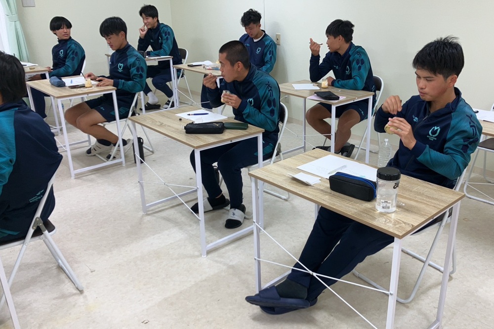 また講話の中では、弊社都農営業所で勤務するヴェロスクロノス都農所属の藤田 大道選手・永野 雄大選手・井上 将弥選手から、アカデミー生へ向けたメッセージも紹介。プロサッカー選手でありながら社会人生活を送る先輩として、仕事とサッカーの両立や試合に出場できないときの考え方・過ごし方についてアドバイスが伝えられました。 目標となる存在である彼らの言葉は、生徒たちの心に大きく響いたようです。