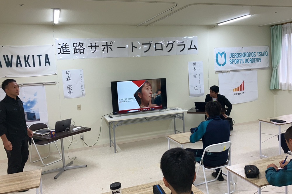 当日は、弊社 都農営業所 副所長の黒木 匠が講師として登壇。ツノスポーツアカデミーの1・2年生10名へ向けて、シフトプラスの事業や、自身の経験に基づいた社会人としての在り方についての講話を行いました。