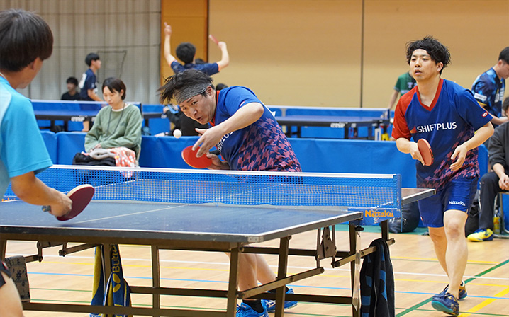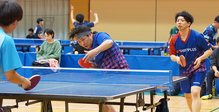 一般の部92チーム・192選手、マスターズの部45チーム、90選手が参加。通常、一般の部とマスターズの部は日程を分けて開催されますが、今年度からは宮崎県卓球協会の新しい試みで同日開催。タイトなスケジュールとなる中、午前中はダブルス(一般の部)から試合が始まり、夕方からマスターズの部が行われました。シフトプラス卓球部からは尾場瀬(おばせ)選手・硴塚(かきつか)選手の2名が一般の部・マスターズの部に出場。例年とは違う緊張感の中、両選手とも一戦一戦集中して試合に臨みました。
