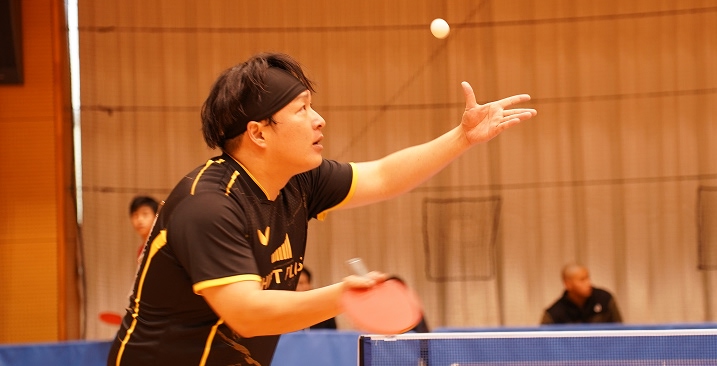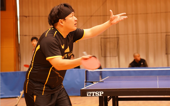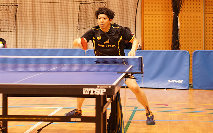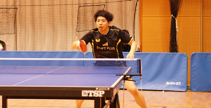 シングルス(一般の部)でも両選手が持ち味を生かし、力強い戦いを見せます。硴塚選手は、初戦から順調に勝ち上がり、迎えた第3試合では、先にセットを奪われる苦しい展開ながらも冷静に立て直し、鋭い攻撃で巻き返してベスト8を果たしました。試合後には、「崩れず立て直せたのがよかった。流れを持っていかれたまま負けてしまうこともある中、今回はしっかり踏ん張ることができた」と振り返り、手応えを感じた様子でした。